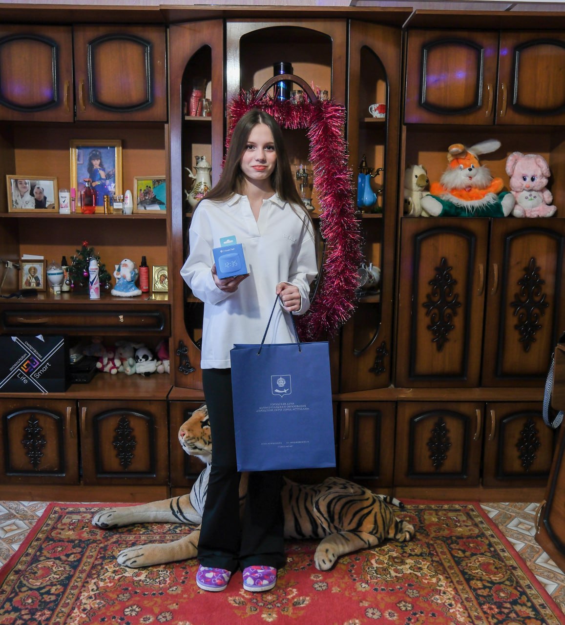 Даша планирует использовать гаджет для саморазвития: голосовой помощник поможет ей быстрее находить ответы на вопросы и слушать образовательный контент. Помимо технологичного подарка, девочка получила и традиционный новогодний набор сладостей.